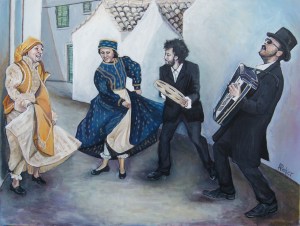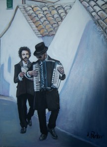 Then I really wanted to paint both musicians and dancers but after looking at the photos  and considering how to put them together, I found one of  two of the musicians walking down the street towards me that I thought had potential. I pretty much enjoyed painting it, though when I realised I was going to have to paint an accordion and hands playing it I thought I might have taken on too much. However I was painting this for myself so I kept going and going  and over and over until I was reasonably satisfied.