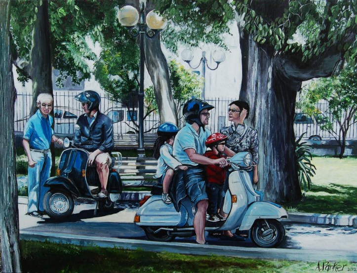 This painting is from a photo I took last summer in Ostuni. I was taking part in an antiques market (trying to sell paintings) and about 10am scooters started arriving in large numbers and it seemed we were double booked along with a scooter rally. It was a lovely sunny day , Ostuni is a beautiful little town, and the “Villa” (park)  where we were is very picturesque. And I love scooters. Hundreds arrived, all colours, styles, makes, sizes and some had even been individually decorated.
