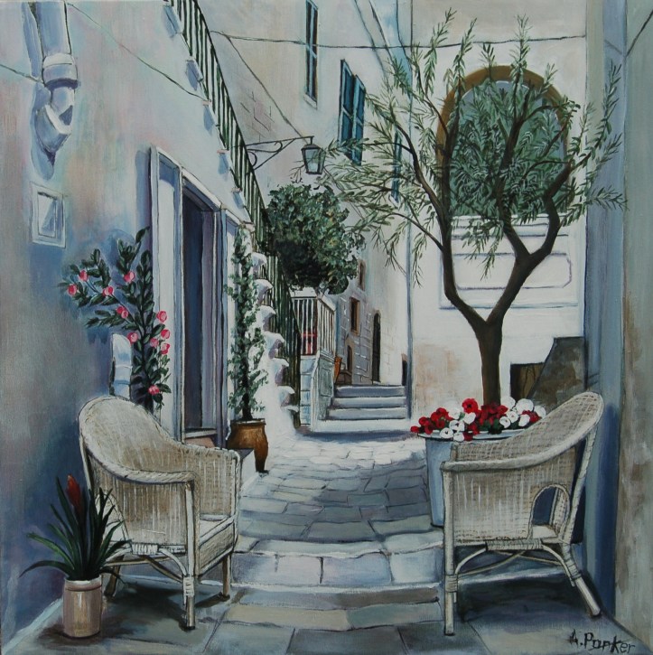 It was odd trying to capture the right colours to create the white on the walls and the paving and the chairs . I have never done this before to this extent. There are lots of colours on the walls as I tried first one colour then another . Then I glazed over the top with another. At first I didn’t like it because it was too blue and it looked cold. Then a friend suggested I try a combination of purple and yellow and that was much better, though it is still possible to see blue and pink showing through. So I ended up with a glorious hotchpotch of colours making white!