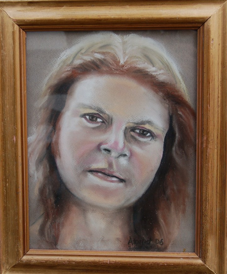 Then I noticed a small pastel portrait which was hanging in a corner. I looked closely at it to see if it was worth including in the group and I remembered how it had come about. It has something about it, which is why it is still in a frame and not put away in the don’t want to throw out folder but don’t quite know what to do with.