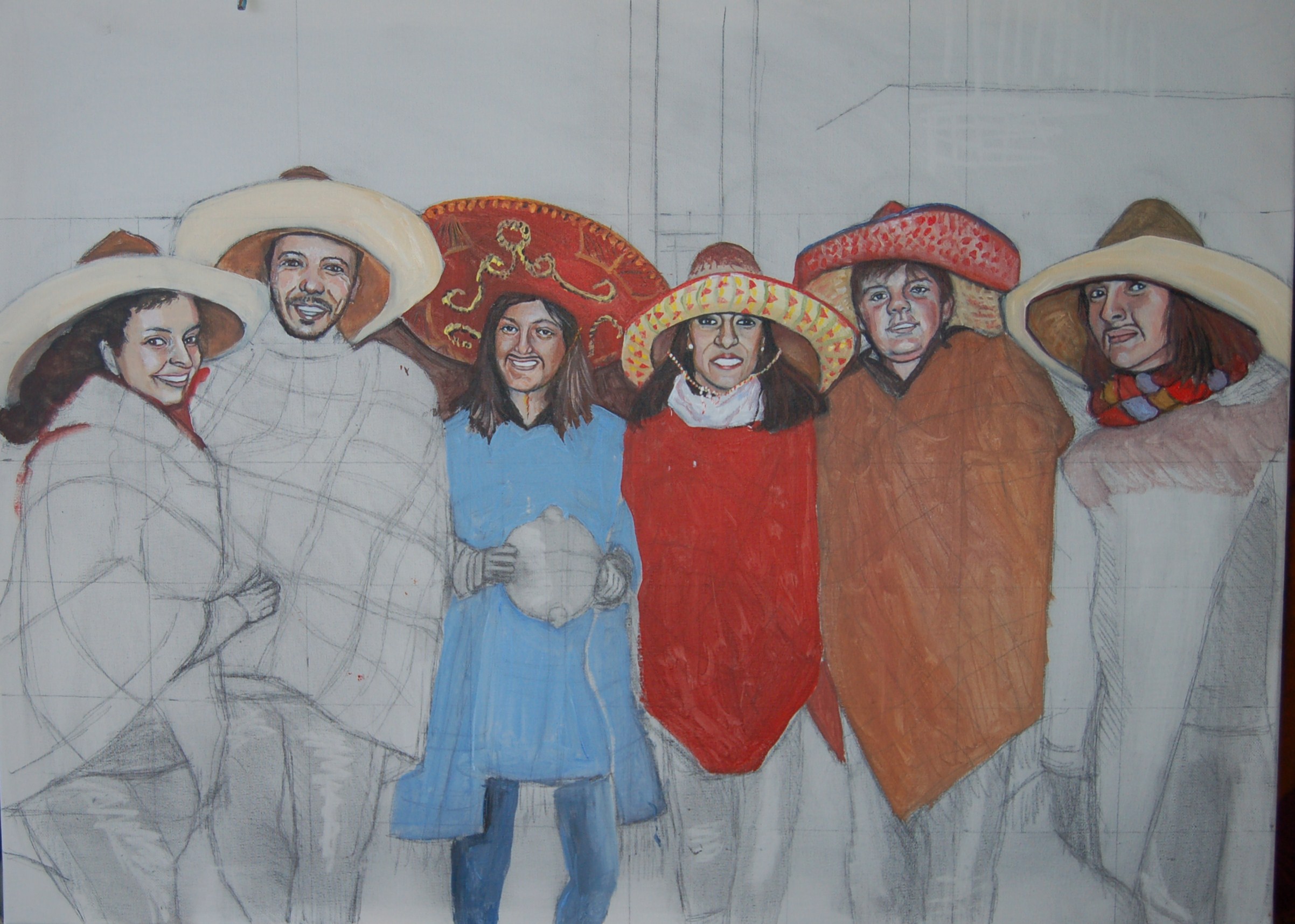 So am working on a painting of 6 people who posed for a photo during the carnevale and it is going to be so colourful as they were dressed in ponchos and sombreros. I have painted all the faces and next week I hope to finish it.