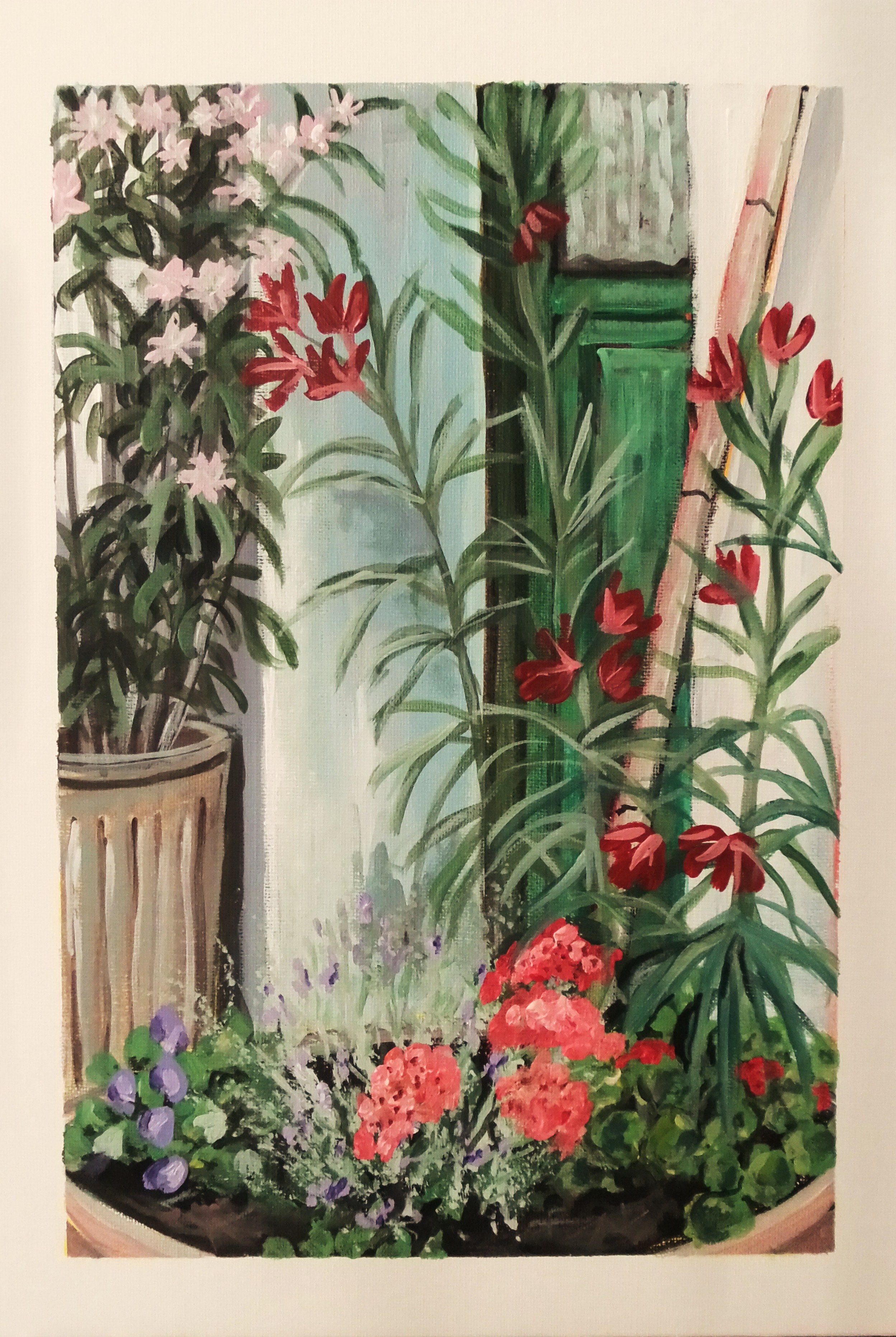And my other experiment this month has been playing with a sort of colourist theory. I have always liked paintings in this style and was curious to see what I could do. I am still using a limited palette – but I have changed the colours, Apart from black and white , I am using cadmium yellow (pale) phthalo blue, and vermillion hue. (I added purple in the painting of flowers at my door as I really wanted the flowers to be the colour they are.)