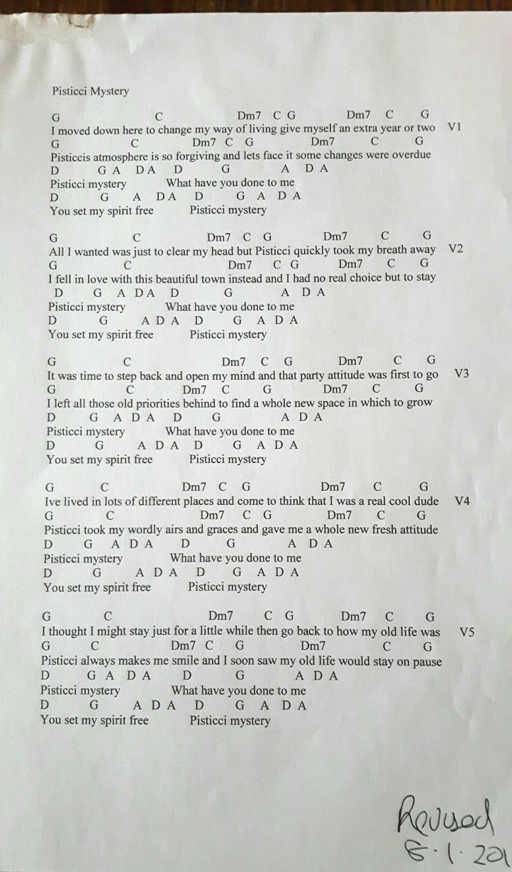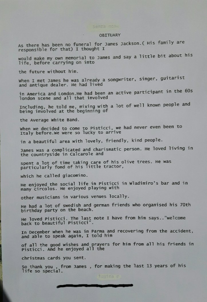 There should be lots of happy photos , an obituary which was particularly aimed at the people of pisticci and a song he wrote about how he felt about living in pisticci.