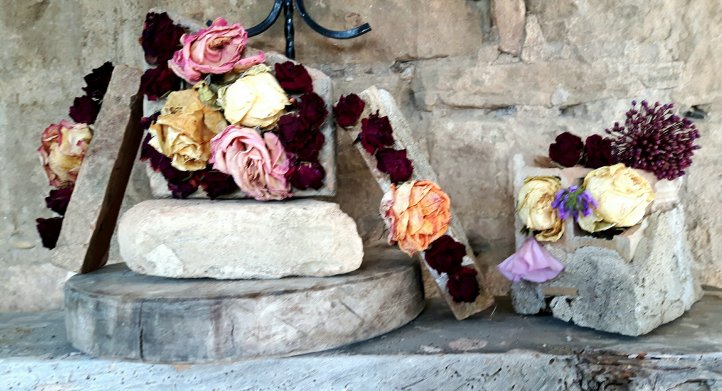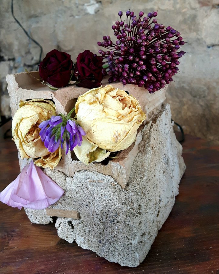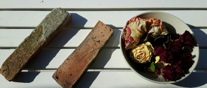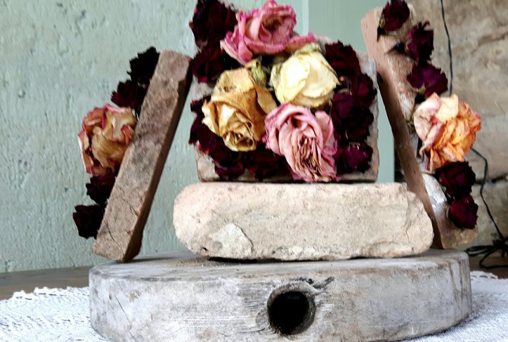Now a small explanation. I love old stones and broken bricks and old wood and dried (dead) flowers. So I thought if I put them all together what could possibly go wrong!