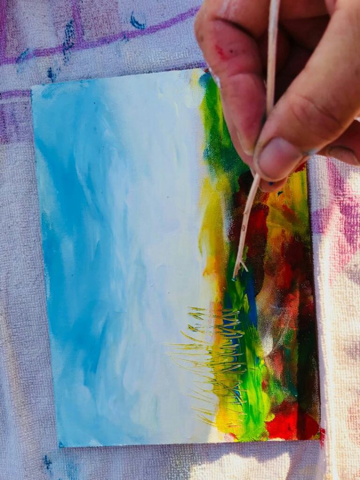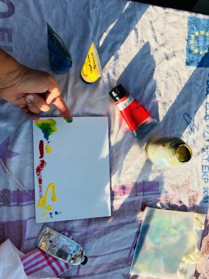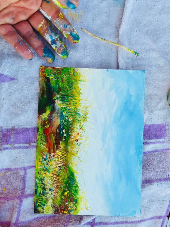 So let’s go to eevi’s next piece of work. She did this using her fingers, a stick and paint and I like it very much.