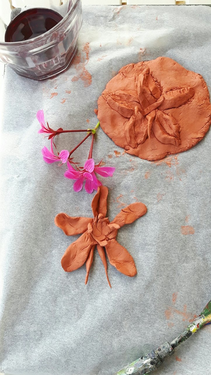 So when I came back to the country I got the clay out. I picked some wildflowers and decided I would try and press them into the clay…..well that was a dumb idea as they were far too fragile…..instead I made a flower , trying to get the leaves to curl up a bit and then I made a little plaque and made another flower on that.