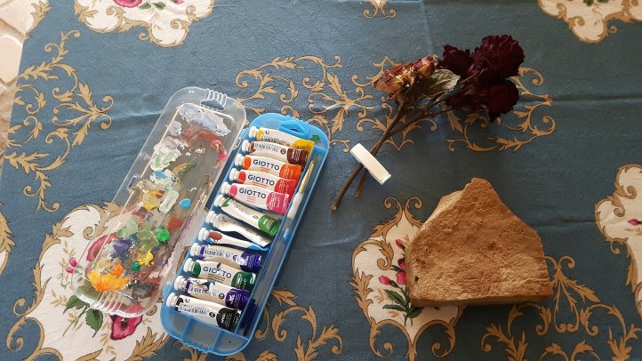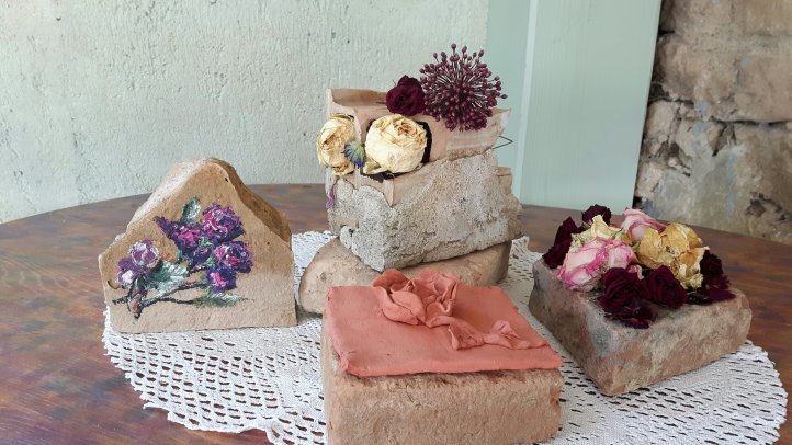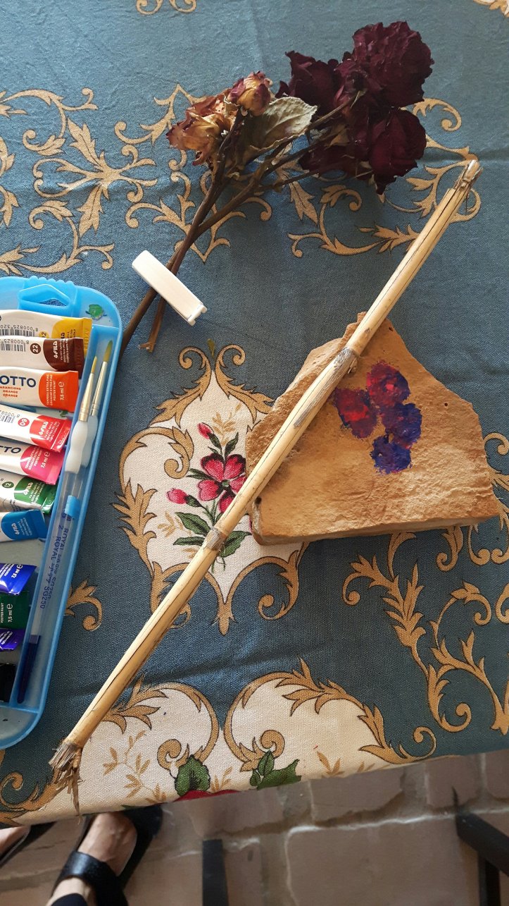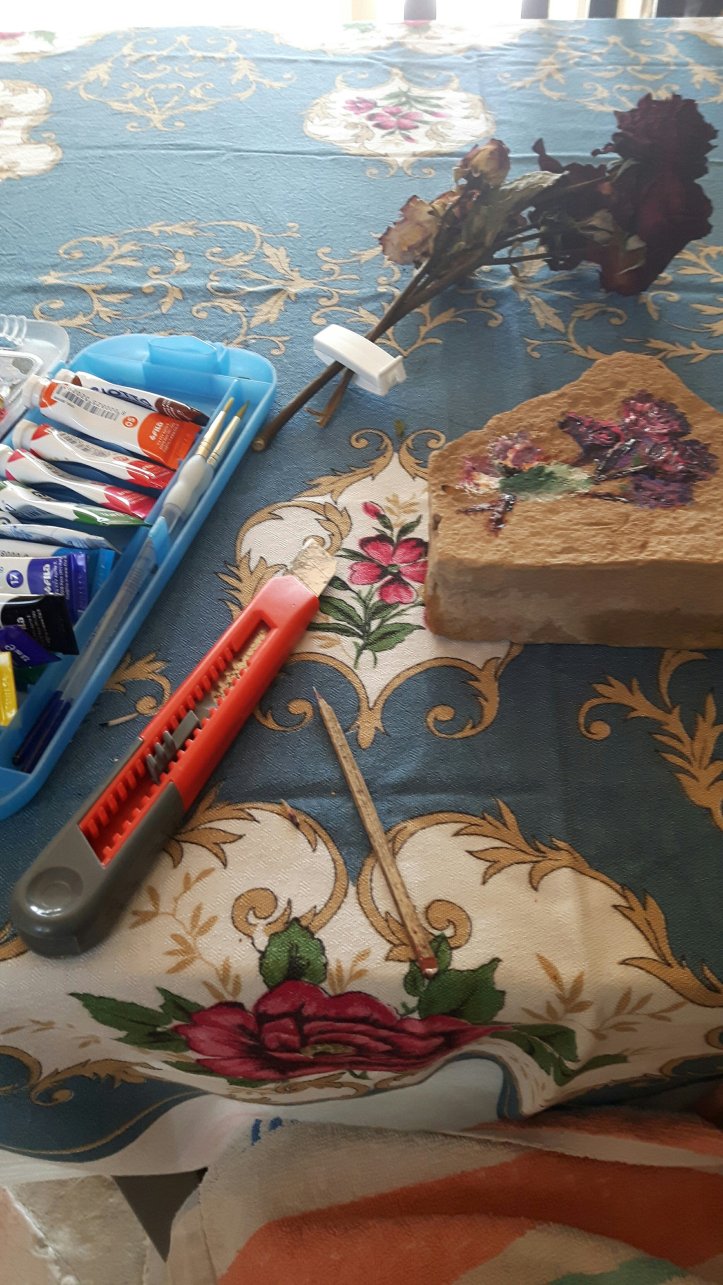 I wasn’t quite brave enough to paint on canvas without a paintbrush but I found an old broken brick and my remaining dried roses and decided to use my fingers to paint.