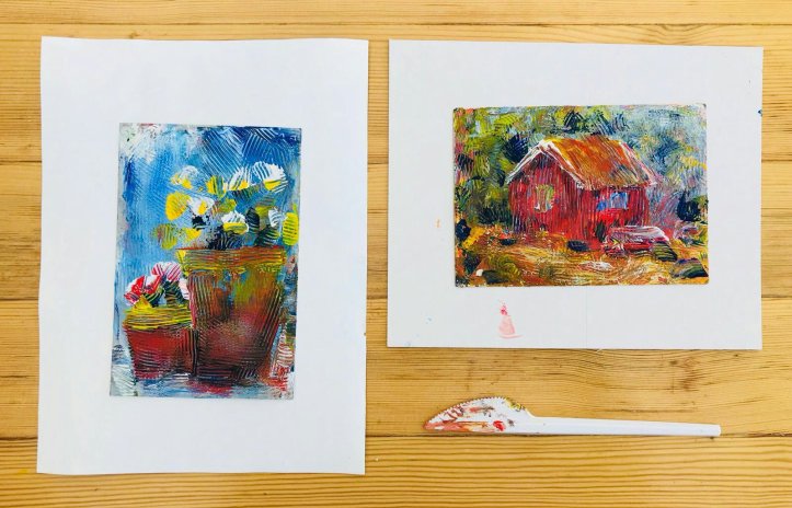 Eevi discovered another painting tool….a plastic knife with ridges. These 2 paintings are great…..what next I wonder.