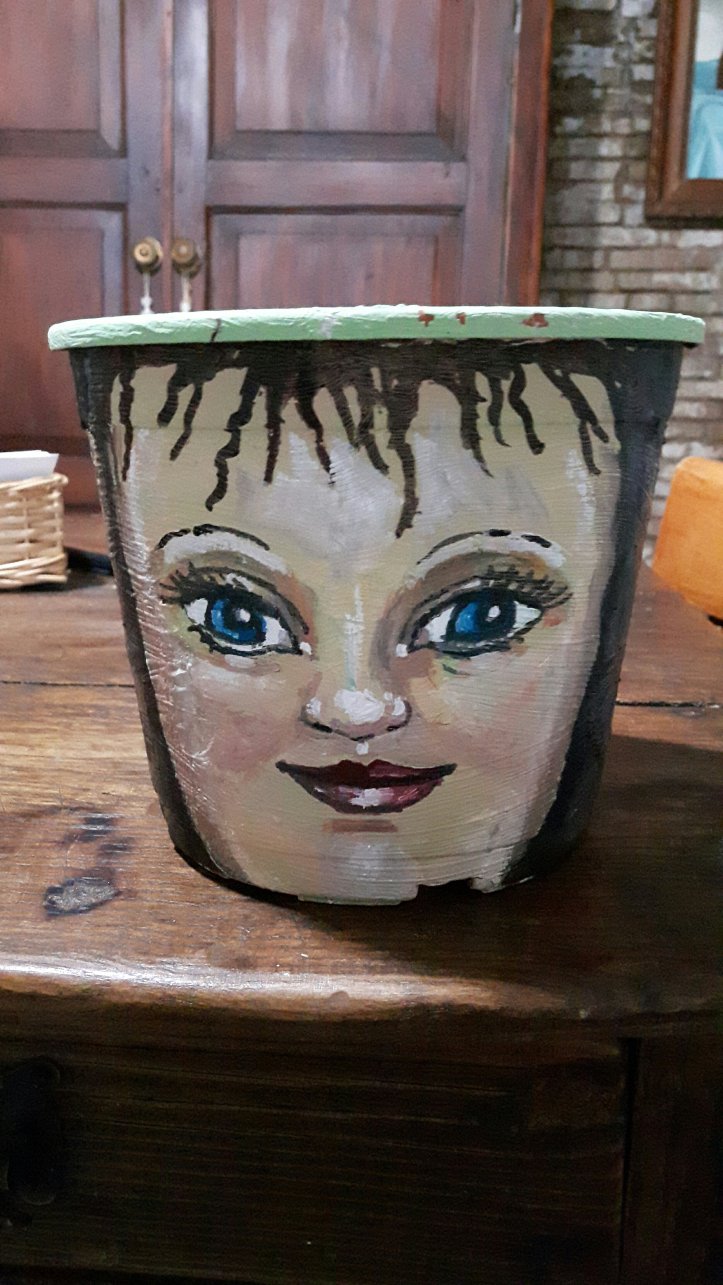 I found some spare flowerpots in the studio so decided I would do my version of eevi s faces on flowerpots. It was very relaxing.