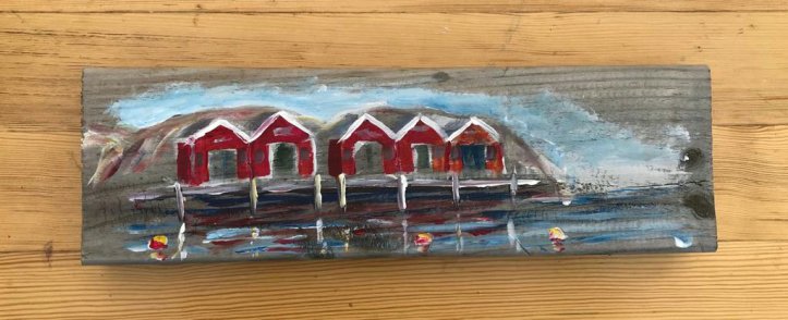 She , meanwhile was doing a version of my little houses on a brick with little red boathouses on wood.