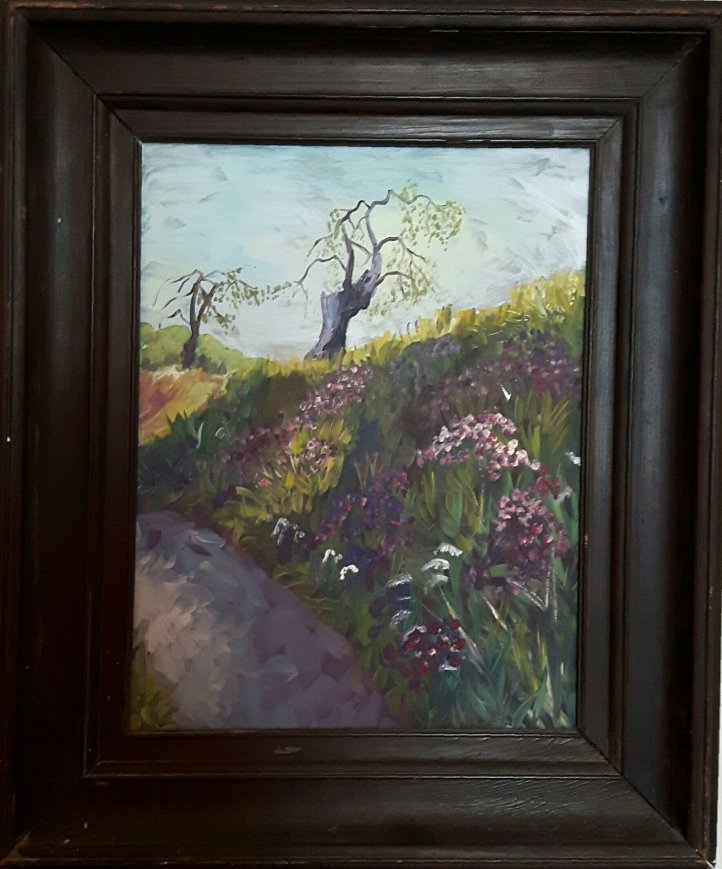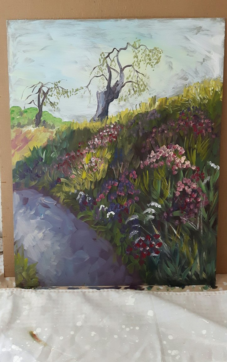 Yesterday’s project work was another painting on glass. This time I chose a photo I liked from a walk I had been on with eevi earlier this year. I loved the colours and the light and the crazy olive tree. I must buy purple paint though, as the flowers were much more vivid in real life but I couldn’t get the intensity with the colours I had…..which are actually old ones that I am using up. Am finding it very liberating painting with old paint ( and white wall paint) on pieces of wood, or glass used in a frame, or canvas where I have painted over old paintings.