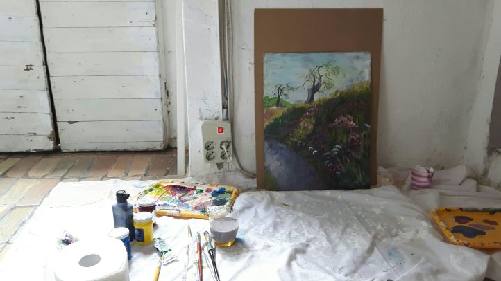 Yesterday I was still working in my old studio doing some little repairs to paintwork , a little furniture shifting but mostly painting new things on old canvases to brighten up and bring some life back to the space . It is now looking more like an artist lived here….and hopefully will appeal to another artist. ( photos included..very reasonable price)