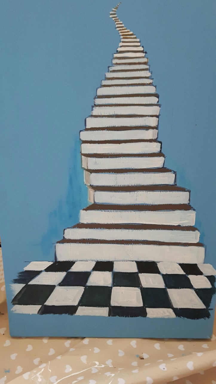Combining the last week with bringing my old studio back to life and painting on glass, using old paintings and a large piece of wood and mixing acrylic paint with wall paint when i run out of white has been fun and my last 2 pieces of work sum up for me the main areas that I would like to take with me.