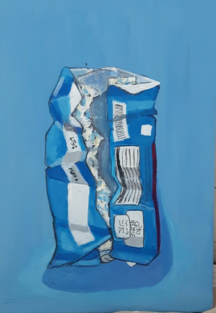 Having done that i found the chocolate wrapper and decided that I must paint it. I kept eating the chocolate before I got round to painting it. It was quick. Didn’t spend more than an hour on it and there is definitely life in it. I could have been more precise but I like it the way it is.