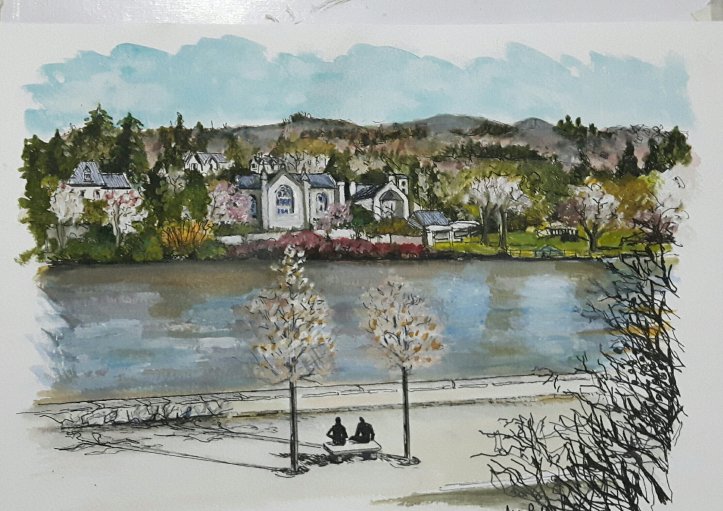 It’s lovely working inside with the sun shining in. This week have finished another 5 watercolour sketches of Perth scenes. I like to keep challenging myself so have been attempting more complicated drawings but the scene with the reflections in the rain was the most challenging. It was from a photo I took in March when I was walking back from wetherspoons and it was so colourful. I didn’t think I would ever be able to paint it so was very pleased with the way it turned out.