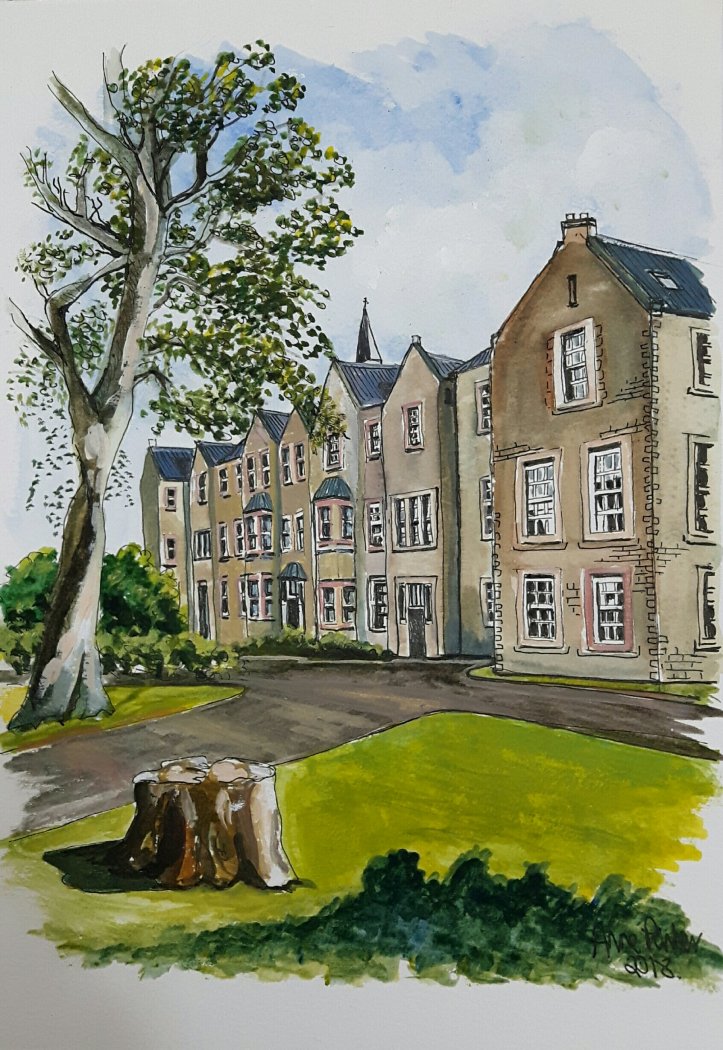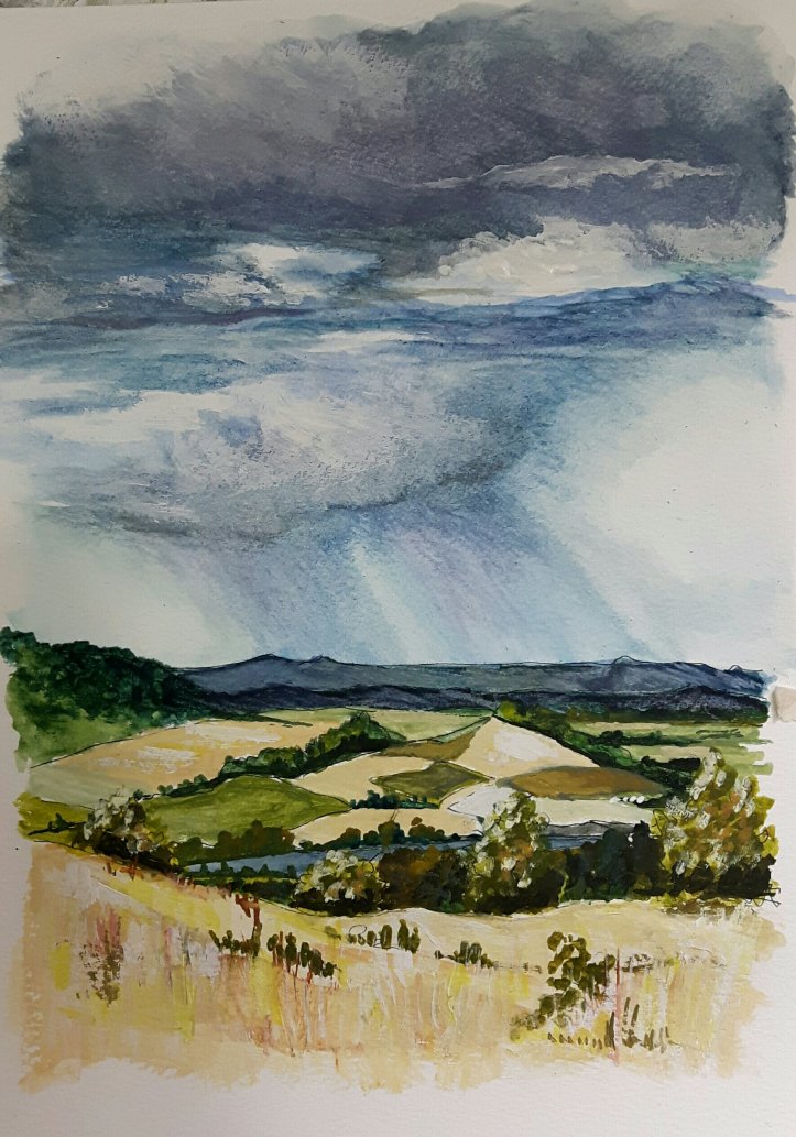 Have added the 3 sketches from last week. Thought i was particularly ambitious painting rain. Have never done that before. There is also a photo of the view from my door step 2 nights ago after the torrential rain and storms had gone. And one of a chocolate and banana cake I made because I was very proud of myself. The sunset is from the bedroom window where i am now and it’s much better in real life….so better post this and enjoy the morning. ….