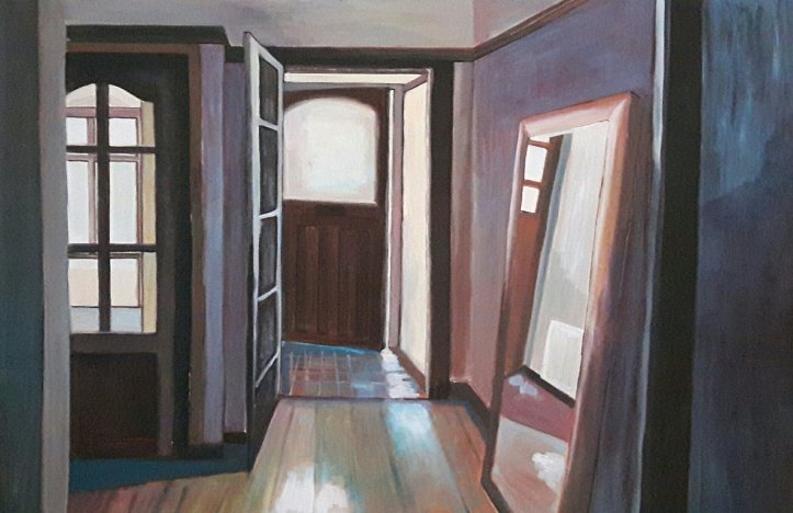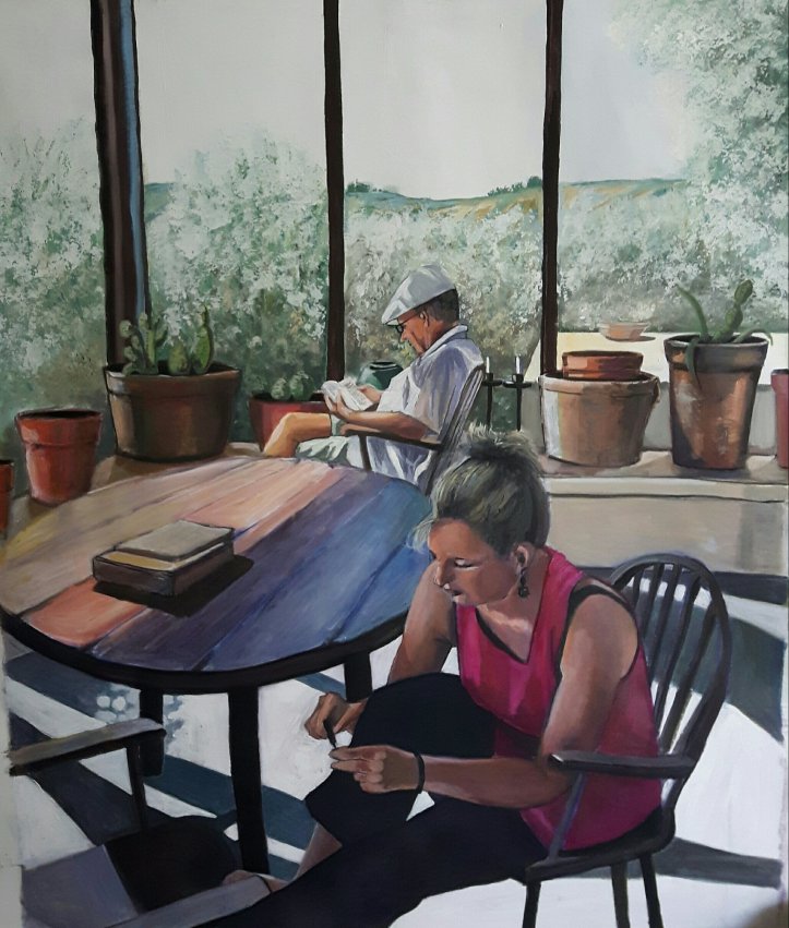 So now will attempt to post in sensible order the 3 large paintings which include one of james and myself. One of a couple on a terrace and the latest one of an interior with attitude.