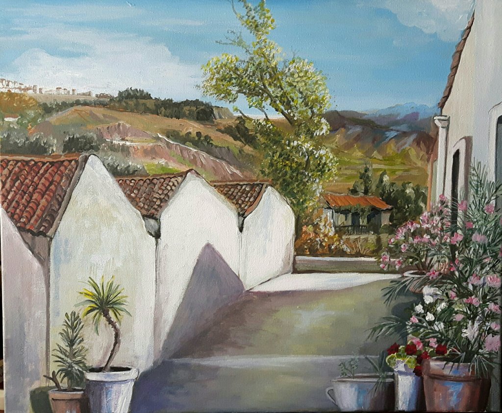 So today I haven’t been further than my new herb garden in a tin bath. Am not sure that I should really have tomatoes and garlic and mint and parsley all in together but it was empty and as usual I was in a hurry to get them planted. As the water was off in Pisticci this afternoon, something broken further up the valley I think I only watered the most desperate. ( in my opinion. ) I think I will be painting another climbing flower round my other door as I sort of inadvertently said so on facebook. But it could be fun …and my other doorway does look a bit bare. I finished the third of three commissions today. They were quite complicated as in I had to partly make up the view and also use a series of photos taken while up a ladder. And I also got organised with sheets etc for my other house which at this rate I will be lucky to rent this summer. But i may as well use this time to get it all ready. Might even sell it yet. After all this virus will eventually go away. It sounds like I have been reasonably busy today and now it’s nearly wine time. Was glad to see I have three two litre plastic containers so no wine emergency so far.