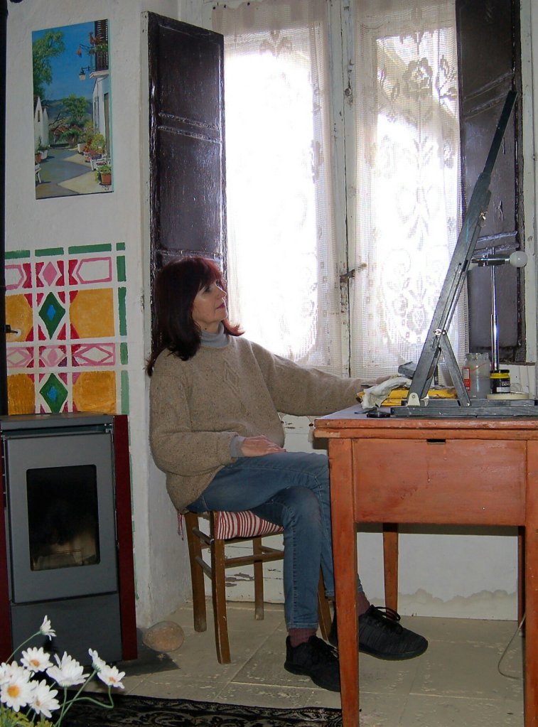 Today I feel like I didn’t do very much as I meant to start painting a mural and then after I had written for an hour and had breakfast I changed my mind and decided to have a planning day. It was beautiful weather again. Sun shining in the window and so I thought maybe I would risk a little walk up by the church behind my studio and take some photos. It was lovely . I saw a few people but no one close. Then as it was so very nice and my pellets will last longer if the stove isnt on I decided to sit on the doorstep and read. It was also partly to stop myself from compulsively checking facebook to see if anything else has happened. If I understand correctly the streets are to be sprayed tomorrow. And I think there is maybe one more confirmed case in basilicata. Though compared to what is happening up north that is not bad. The reports from lombardy are awful. However I am here and needing to fill my time with interesting things if possible. Next I did some research online….. otherwise described as looked at photos of roses painted on walls so I could get an idea of what to do. I found something suitable. After lunch I started planning for my other project which is to paint a self portrait in the style of Gwen John. That involved more ” research” and then balancing my camera on top of a cushion balanced on the top of a chair and using the timer. I am horribly unphotogenic but I consoled my self by thinking I would paint myself prettier. I think I imagine myself much younger than I am. So am now ready to carry on with both these projects . Incase anyone is interested I am including the reference photo of myself and one of Gwen Johns’ with colours I would like to use. Am curious to see the end result.