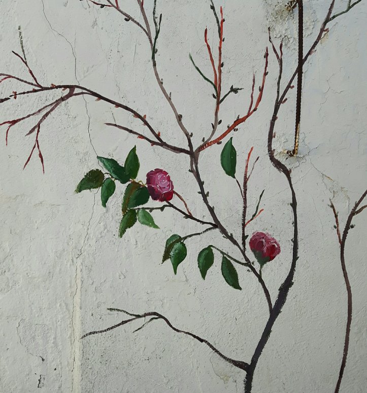 I have been awake since around 3am which is not the best way to start the day. However I can now do paragraphs instead of a big lump of writing so my awake time was not a complete waste.This morning I reached 20000 words of part 2 of my book. Am not sure if it was cheating, but when I realised I only had 300 to go , somehow I just rattled on in chatty fashion and stopped at 20060. It was friday and I like a bit of order. Am definitely getting curious to see how it will all work out. I would like to say that I worked hard all morning on drawing or painting rose branches on the wall, but actually it got too hot. This weather is unbelievable in a good way.I have been trying and not succeeding to stay off the internet as I think I am now worried about my family in Scotland. Here in the south of Italy I feel that the government is taking care of us and apparently 89% of Italians are supporting the shutdown.But what I am reading in the UK is all about “herd immunity” which appears to mean that a lot more people will die than if they successfully slowed down the spread of the virus by keeping people apart. There was even talk of culling the old and sick. Whatever eventually happens its not very reassuring right now. I think I sound a bit scaremongering but then a week ago I would not have believed that I would be staying in my house and needing a document to allow me to go shopping. And a lot of people have died in that week.Today I felt a bit shaky. I told myself that it’s not surprising as I have never done this before and too much time on my own is difficult. My neighbour is home now but is not a chatty man. And the old lady above is deaf. And I am a little anxious about going shopping. I havent run out of food but I would like to feel I could go. I have the document which I need to fill in. Am trying to persuade myself to go tomorrow after lunch and buy something nice to eat on saturday night but am not sure that I won’t make another excuse not to go. Like it just popped into my mind that I could try out my barbecue and I have already got sausages in the fridge.Am trying to take this day by day and as it could go on for a long time I need to get used to it. To distract myself I went out now that it’s cooler and painted some leaves and a couple of roses. It looks ok but I need some practice to paint roses. I would like to make a good job of this mural and I need the work.So it’s nearly wine time again. Hurray! And that’s another day done and not wasted.Tonight there might be a flash mob of people singing from their balconies. Doesnt work for me but someone is sure to video it.The new expression going around now is ANDRA’ TUTTO BENE. Lets hope so ….and not just in Italy.