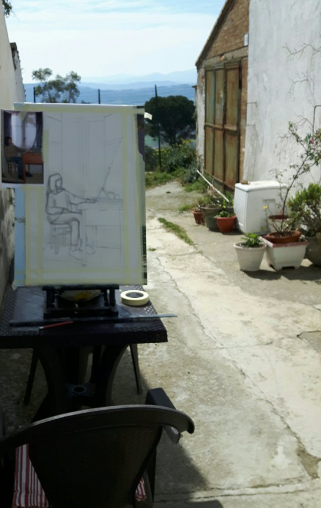 I thought , as it was quite cold inside that I would try working outside and thanks to a heavy flowerpot my table easel was quite steady. With quite a lot of rubbing out and adjustment my self portrait, now even more vaguely in the style of gwen john is now ready to paint. After the canvas blew over I had lunch.