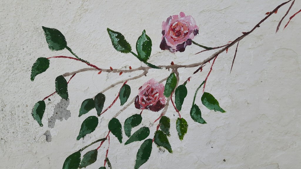 After some emailing and more scrolling through facebook looking at more videos of Italians singing from balconies I decided I might just paint another couple of roses. That was fun and even more so when a little dog came to watch. This mural could take some time.