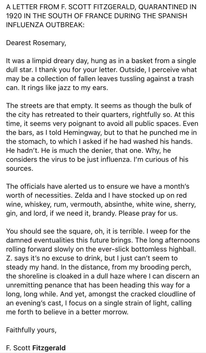 In among all the other stuff today I found a tweet with a letter written by F.Scott Fitzgerald while he was in quarantine during the spanish flu. I thought it was just wonderful and now I want to be able to write like that. To be funny and moving and beautiful. It was like looking at a painting which goes right to your heart. Oh what fun I could have trying to create something like that with words. Right now I just write how I think in a kind of embarassed get it out there way. Because I think if I tried harder I wouldn’t or couldn’t do it. But maybe I will now. Sometime.