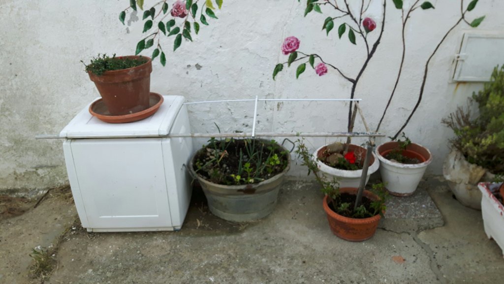 I have varnished my rose mural so it can rain now and have made a frame for a temporary green house to protect my little herbs from the snow that is forecast.