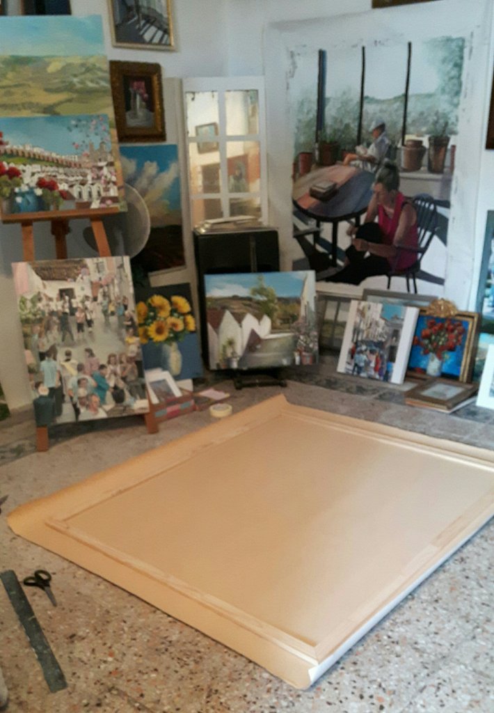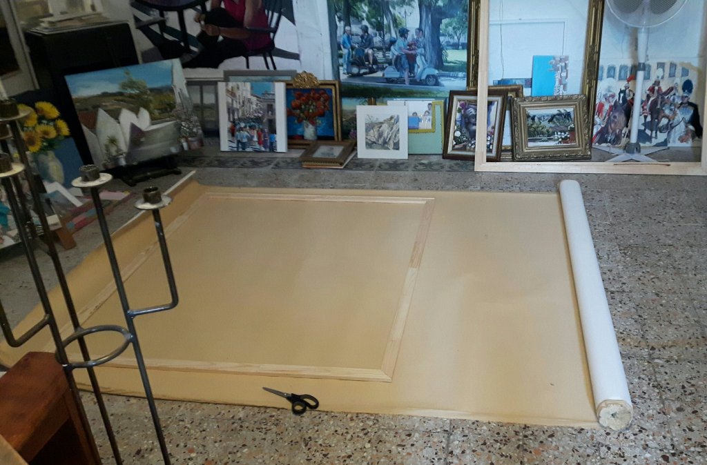 I have a complicated relationship with machinery and staplers don’t like me. And I don’t understand how they don’t just work but insist on jamming just as I am nearly finished a job. I have stretched canvases before successfully but never one as big. I even have a special tool to do it properly which works well when you don’t use it upside down. So this will probably take me several days to complete. Today I cut the canvas. Even that was stressful. However I think I have left enough at the edges. And its straight. Tomorrow I may look out the stapler and the special tool.