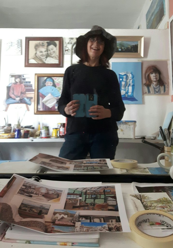 After a brief siesta ( not entirely guilt free to be honest) I looked at self portraits by women artists online and wondered if I should try and get a better photo to work from for my next big painting. I found the perfect spot in front of my new gladiolas. Then I had to work out how to take the photo. With the aid of a chair, table and flowerpot I managed. It took about 20 shots before I got sonething J liked but this time I think it will work.