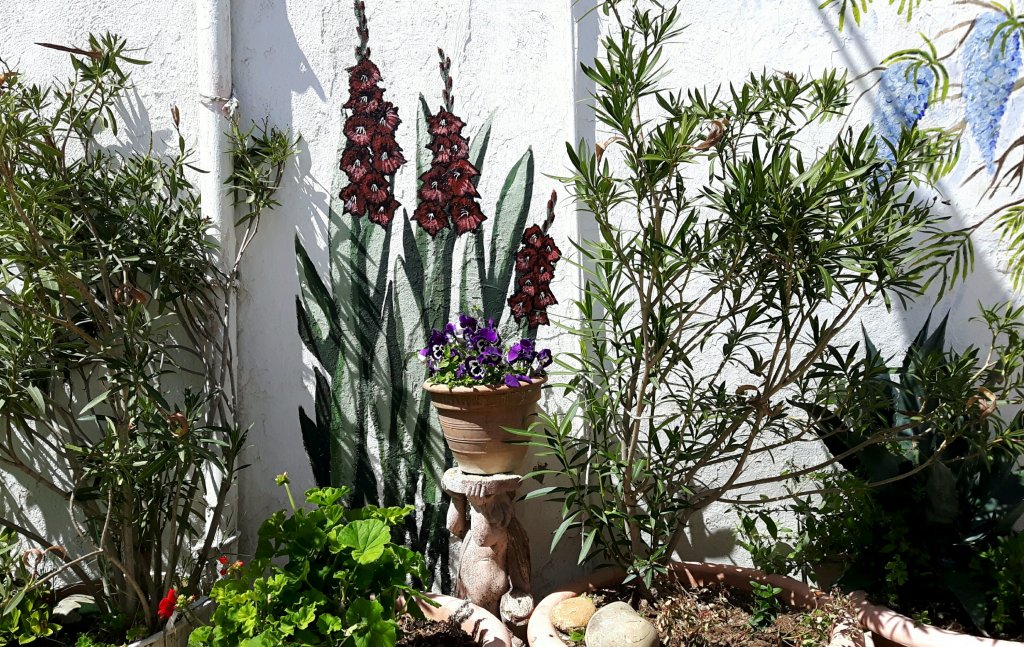 I started painting about 9.30am as there was no rush….. only there should have been , because by 10am it was really hot. I eventually had to go find a sunhat as getting sunstroke would be downright careless. I am being so careful and using up all the left over paint. I had forgotten that there was some left over white wall paint in the cupboard as am running out of good white acrylic and I have a portrait to do. ( no sign of the white paint I ordered online.) It was a treat to paint long leaves as frankly the other kind are boring . And technically painting on a wall with a rough surface makes edges difficult. So it was fun drawing big pointy leaves. Then the flowerheads went well. I checked photos of them online and then simplified the shapes and colours and that seemed to give the right effect.