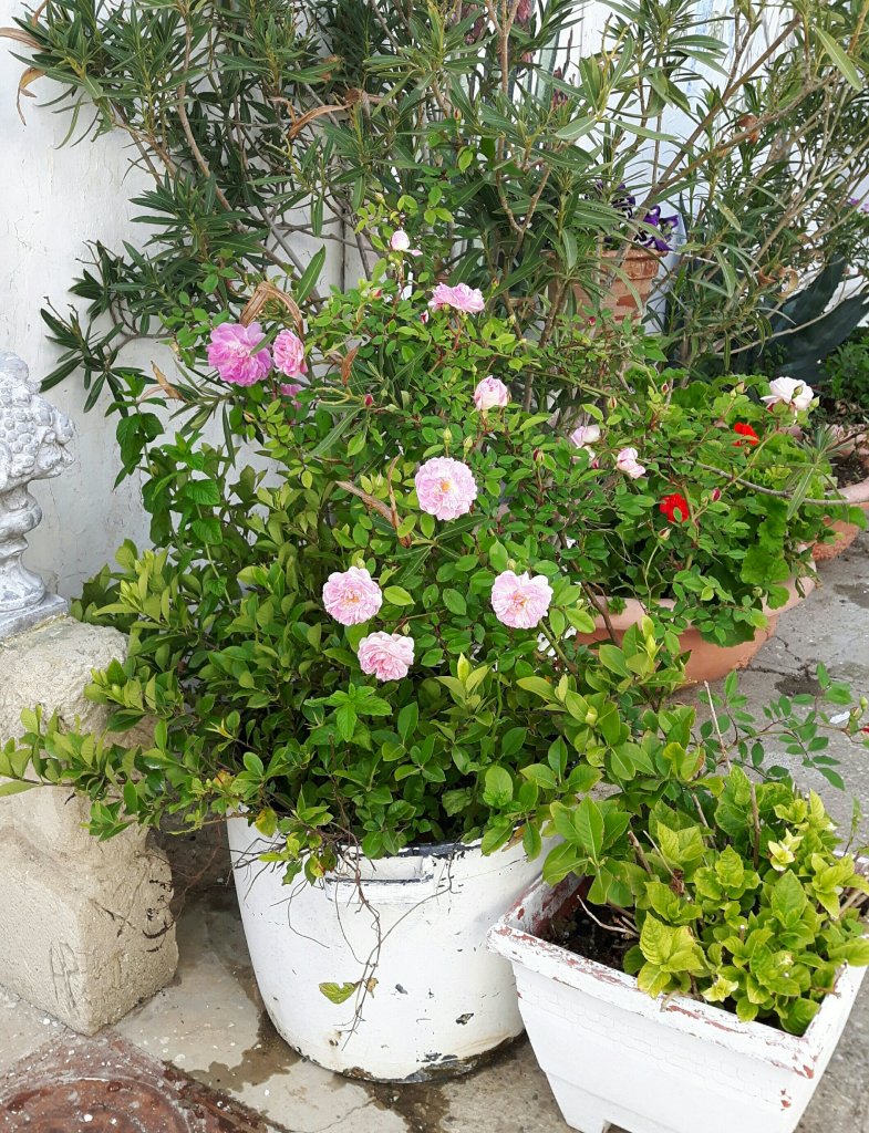 I have had time to notice my roses starting to flower and several have bloomed since this morning. I also had time to decide that my wisteria which I based on a wall painting of a wisteria and not the real thing would be improved by having a lot more leaves.