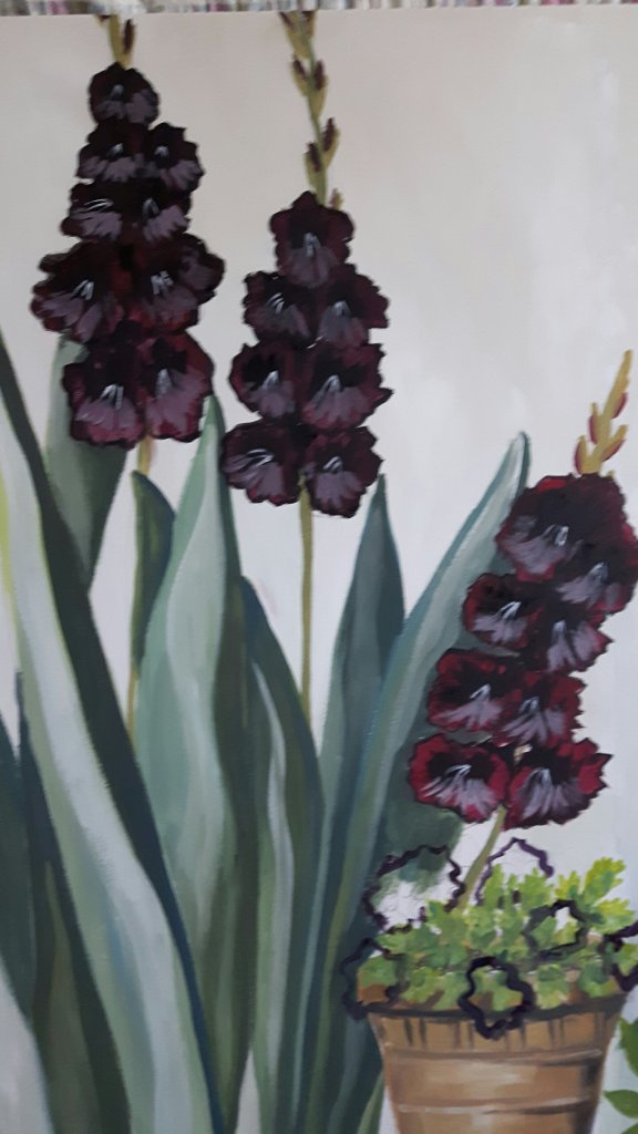 My self portrait ( now I think I am narcissistic because I am painting a BIG self portrait…..) is going well. I painted the gladiolas today and in my narcissistic opinion they look great. I looked up what they mean in the language of flowers and they represent strength and integrity. If I was not so honest then I would obviously say that they were chosen specially because of this. But I actually just needed tall dark flowers.
