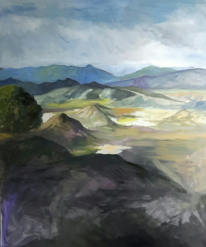 I wasn’t going to do anything else after that but my big painting was just sitting there and after some good advice to leave it loose I thought I ‘d just do the sky for fun….and it was. I used a big brush and enjoyed myself. Ons thing led to another and I finished the big tree and added some more colour to the valley and darkened the foreground . I love it.