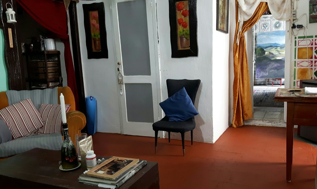 I thought it would be a big job and take all day , and that I would need 2 coats. However about half way through it was obvious that there would not be enough paint for another coat. I had moved some furniture, turned up the edges of the rugs and brushed the floor so I felt well prepared. I used a little brush to paint all round the edges first so that it looks quite neat. I remembered about using the toilet before I started to fill in the main part of the floor and unlatched the main door so I could get in to the other side of my house. I had the door wide open in the part I was painting. So I carefully painted myself out the door and admired the nice job I had made before heading to my other door. Only it wouldn’t open because I had only partly un latched it and it was still fastened at the top. I was a bit taken aback. I considered sitting outside for a couple of hours then decided that was not a good plan. I had the paint and a brush with me so I took my shoes off and carefully threw them one at a time in the door and round the corner through the narrow doorway into the workroom. Then I walked carefully backwards in my socks , painting carefully over the footprints I was leaving and arrived in the workroom beside my shoes. ( my socks are in the bin….but no footprints on the floor.)
