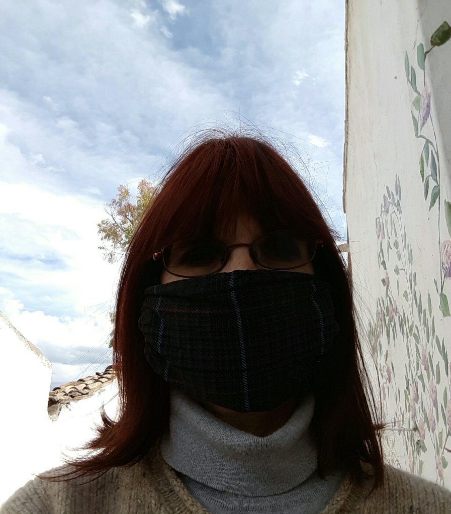 I even wore my homemade tartan mask , made out of a pair of tights and with a pocket for a filter . It matched my dark wine coloured jumper and is the most comfortable one I have made so far.