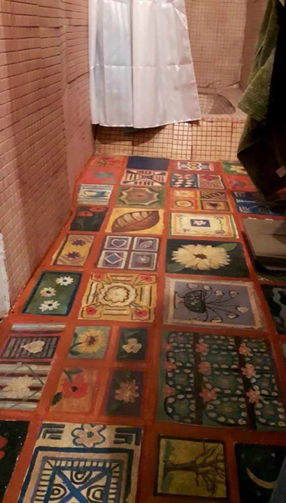 Having tried to have a lie in but got bored I got up with no particular plans. After breakfast and turning off radio 5 live as it was much more upsetting than reading twitter I thought I may as well use some of my terracotta paint and cover all the ” not very white, in fact quite grey and yukky looking” lines between the painted tiles in the shower room. That took me about an hour and looks better….well different at least …and cleaner and is now coordinated with the living room floor.