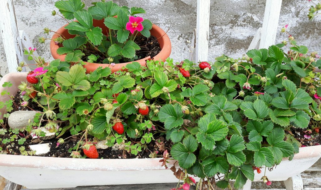 I was wondering what photo I could put online this morning and went out and discovered that now that the wind had gone it was quite warm. It was then I saw all the strawberries. These strawberry plants are survivors. I think they are about 5 years old and still they have fruit. That was very cheering and delicious.