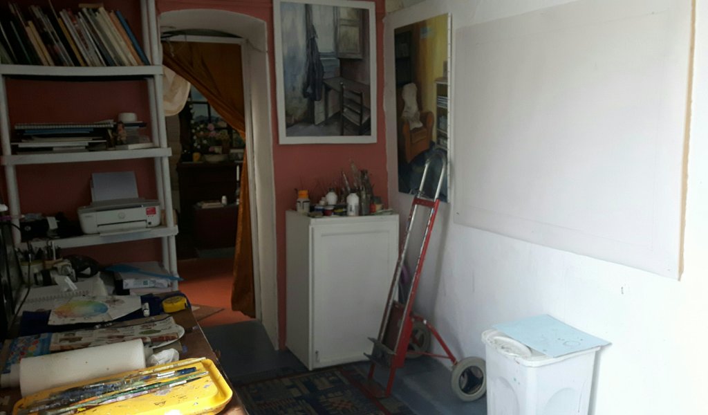 That was not very satisfactory and it took me about an hour to decide that to change round my work room was my only option. So that took another 2 hours by the time I had moved the printer, cleared the big folding table,taken a hammer to it to get it folded down and then shoved it under the bed, rearranged a lot of paper and my watercolour equipment, taken the staples out of the canvas, nailed it to the wall, moved the cupboard and finally painted the floor underneath it as I hadn’t bothered before. But I am organised now and can start tomorrow. Good thing that I have given myself 2 weeks to do it.