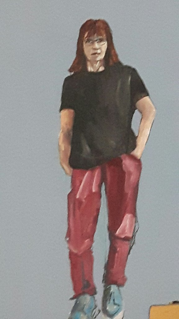 And that was pretty much today done except for another dose of David Hockney documentary. I wonder if it will influence my painting. While I was cutting the canvas I looked up and saw the self portrait I did on a blue background on a big piece of hardboard . It was done quickly and partly from life and I like it a lot. It reminded me of his portraits. Maybe I really will have a go at a series of portraits… whole body, not just faces. That would be exciting.