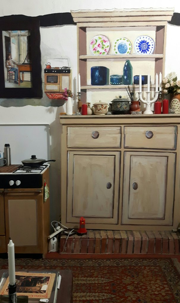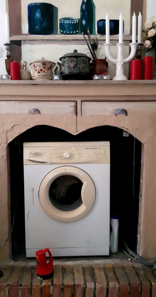 It is in the fireplace behind a painted board that looks like the bottom of a cupboard. Its only partly plumbed in and it leaks. I don’t use it more than once a week and am always grateful if it works. I have a system for keeping the hose in the sink, otherwise it jumps out and the water goes all over the floor. I also keep a big torch handy so I can check if the leak is getting worse. But compared to washing everything in the bath when I lived in the countryside 15 years ago, it’s bliss.