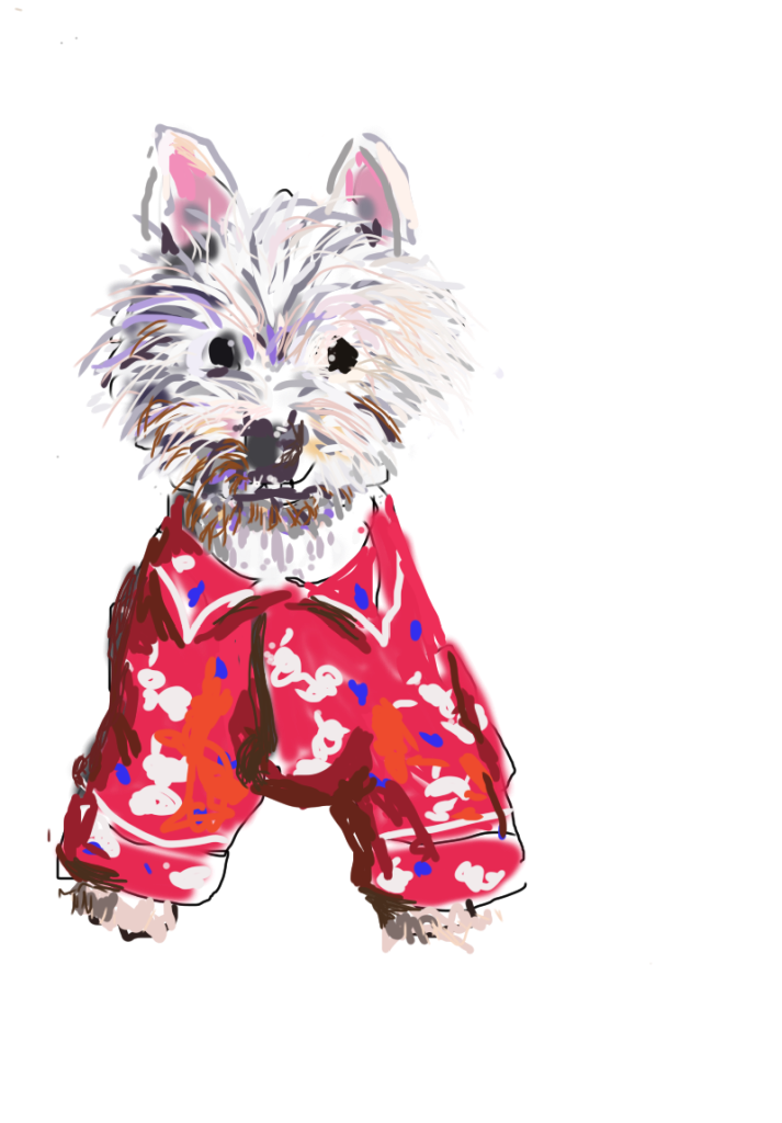 By 9am this morning I had washed my hair, had breakfast, written some more of my latest writing thingy, found my new “spot” to work from for the summer and drawn a sweet little dog in pyjamas. ( My daughter’s dog) And I remembered my 5 salutes to the sun. It won’t make me fit but it keeps me bendy.