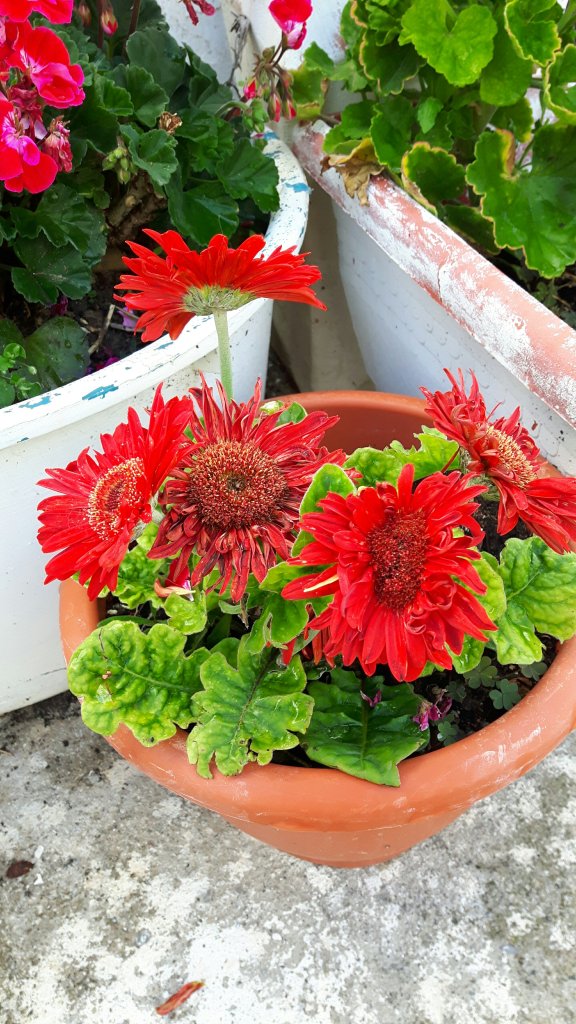I had time to look round my little garden this morning and it is looking very red. Some of my geranium cuttings are flowering. And my wall flowers are blending in nicely.
