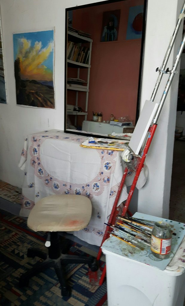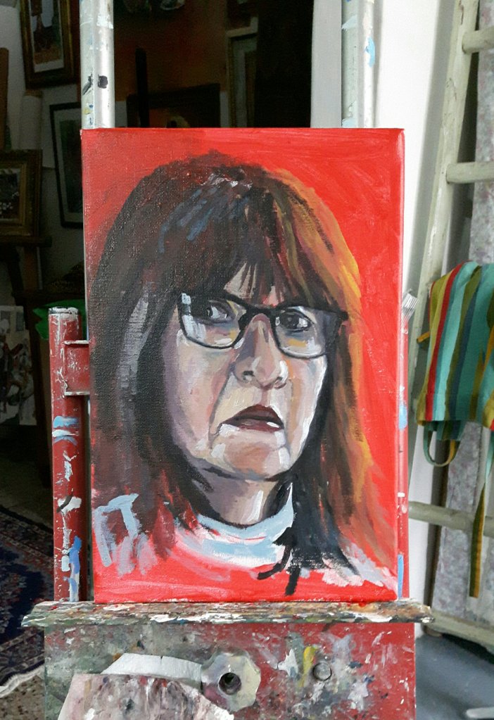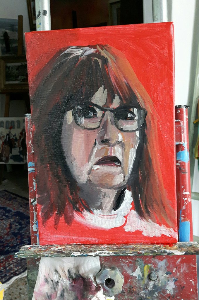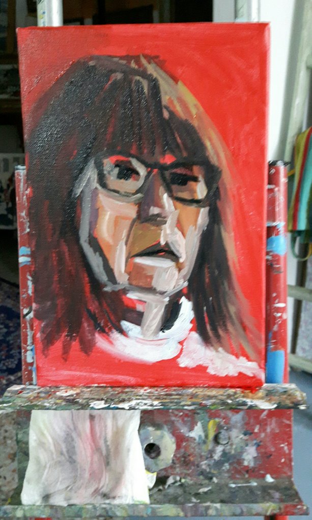 Back home again I was inspired to paint another self portrait. I got all set up and balanced a big mirror on the top of 2 gas heaters. ( I forgot that the mirror is slightly tinted) Outside a storm was brewing and it got darker and darker. But I was determined to see if all that video watching had made a difference. It had in one way in that I didn’t think because it looked awful at the beginning that I couldn’t fix it. ( ahem….that was hopeful!!!).