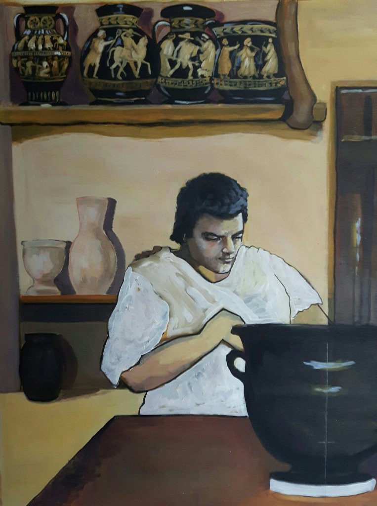 Back home I am still working on the second pottery painter panel and today I added two terracotta pots to connect the pottery maker to the pottery painter and then I stood on a chair and decorated 4 pots in a rough approximation of the style of the painter of pisticci.