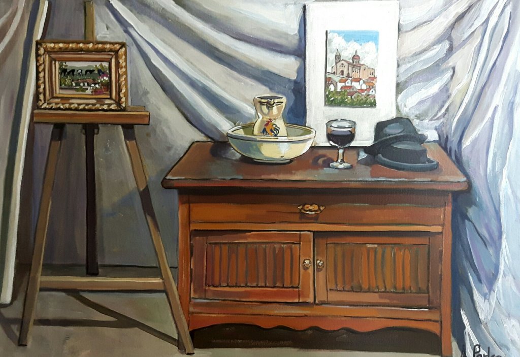 Nothing is ever as good as I imagine it will be, but it’s not a bad effort. So much so that I have set up the next one. I am thinking of calling the series 2 black hats and a wine glass. The paintings in it are both of Pisticci, the cupboard is a local antique and the jug and basin are from a nearby region. I have chosen some antique dishes and a pottery jug and two more paintings for the next one. ( and the 2 hats and glass of wine.)