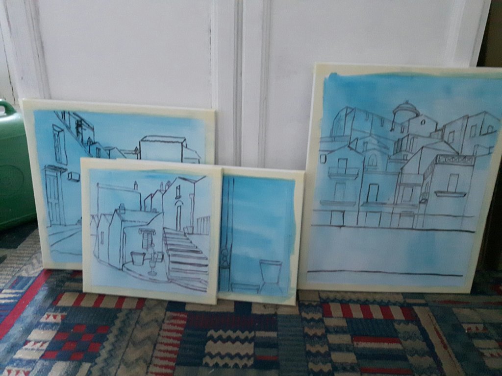 On the way to the hardware shop I stopped and took a few photos so now I have drawn and put an undercoat on 4 more canvases. That should keep me occupied this week. I will try and paint them with a bit more enthusiasm even though they do include quite a few little white houses. I ‘ve given them all a turquoise undercoat so that might jazz them up a bit. One of them is a completely new view , 2 are old favourites and the last one is my doorway looking all romantic.
