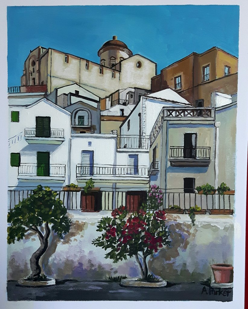 By 9am I was at my easel having decided to paint the biggest and apparently most complicated painting of Pisticci .Apart from brief reading breaks I have been there all day. And it is finished. It is 40x50cms.