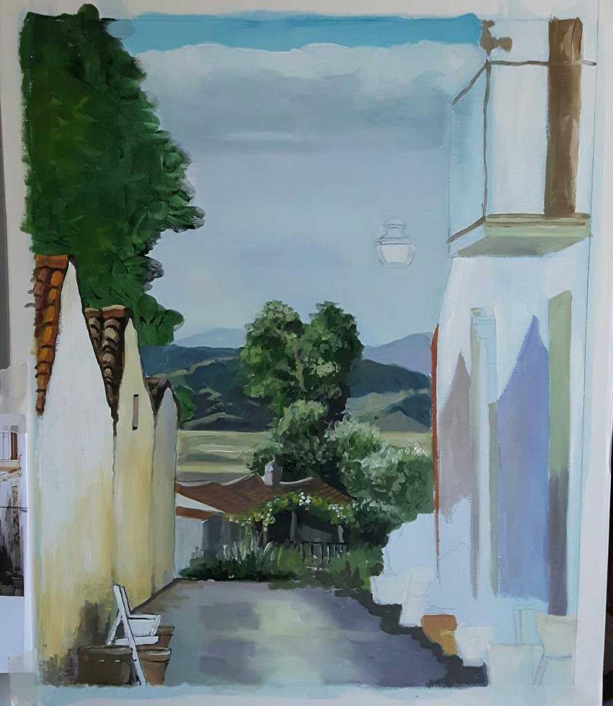 I am working on one of my street and then I have another small canvas. I think I had better do more to replace the sold ones. I could be very busy this week. Very busy……