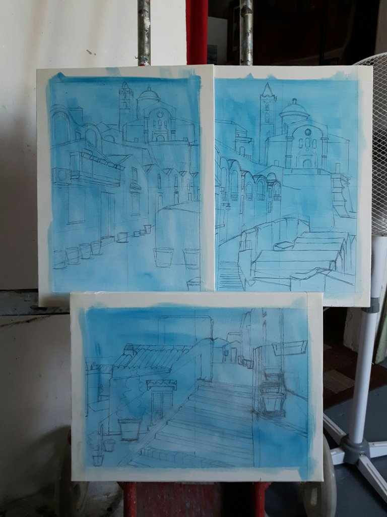 I ‘ve drawn scenes on 3 30x40cm canvases today and then undercoated them with a turquoisey wash as that is my new ” thing”. It bleeds slightly under the masking tape at the sides and when the painting is finished and the tape is removed it leaves a sort of arty glow at the edge…..er sort of……I just like it. 🤔